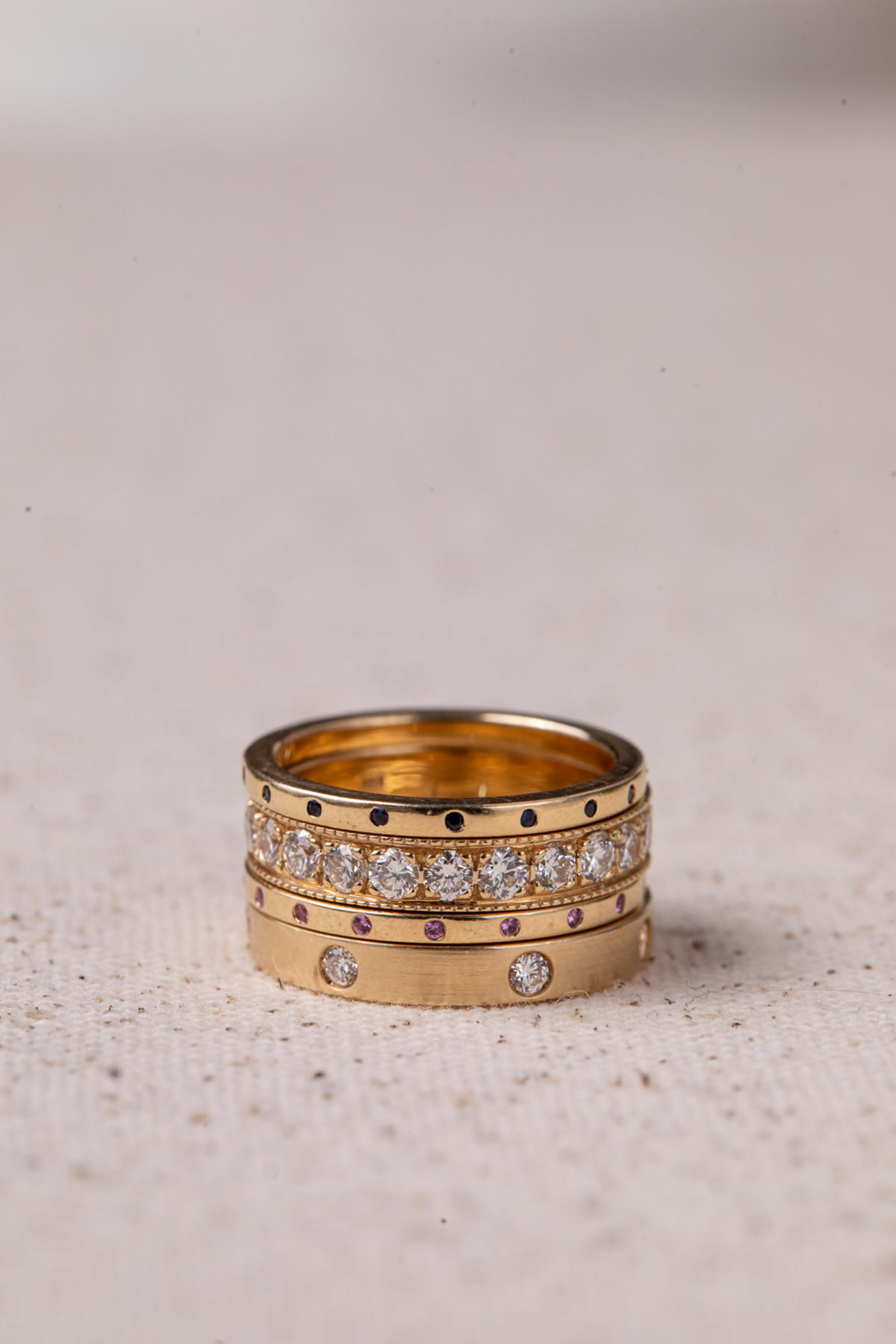 The Thin Version Of The Les Points Stackable Ring Is a Best-Seller From Our Collaboration With Interior Designer and Blogger, Erin Gates. The Les Points Stacking Rings Are a Modern Classic and OG Part of The GATES Collection by M. Flynn. Add a Subtle Pop of Color With The Pink Sapphire.