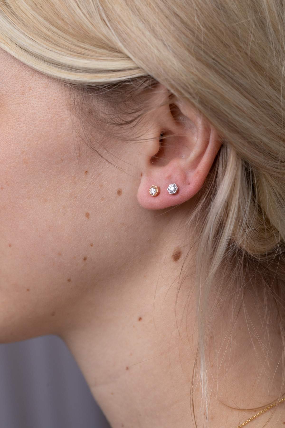 Elevate your everyday style with these delicate Tiny Hexagon Stud Earrings, crafted in luxurious 14K white gold and accented with sparkling white diamonds. Their geometric shape offers a modern, minimalist look that’s perfect for daily wear or effortless layering. Lightweight, timeless, and effortlessly chic—these diamond hexagon studs add the perfect hint of shine to any jewelry collection.