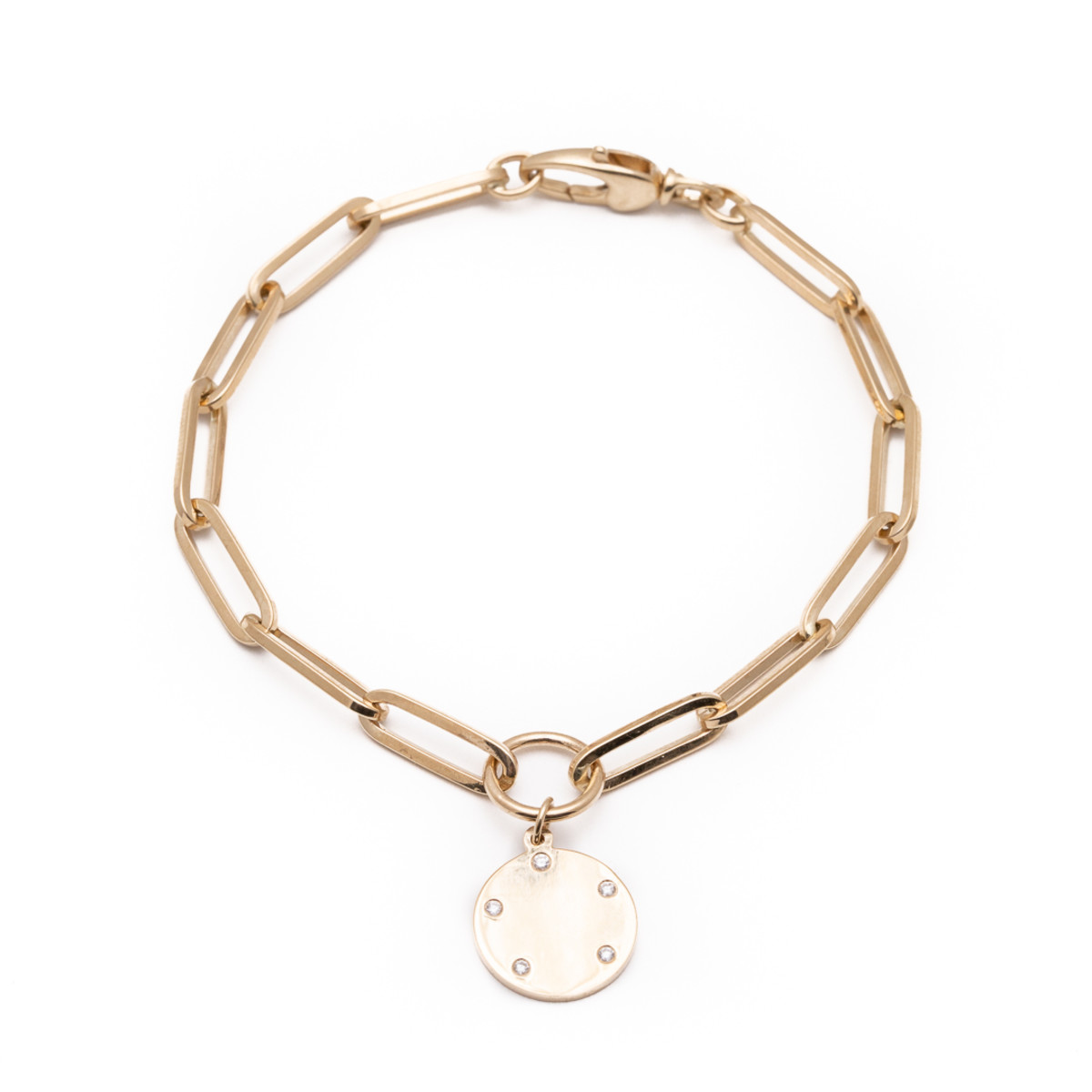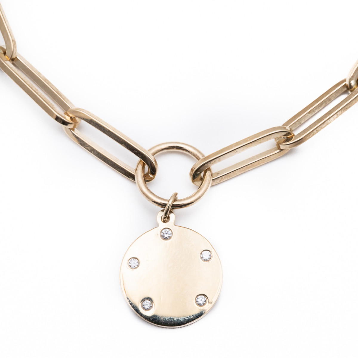 The Token Bracelet is a part of The GATES Collection by M. Flynn and features an engravable disc surrounded by diamonds on a thick paperclip style chain.