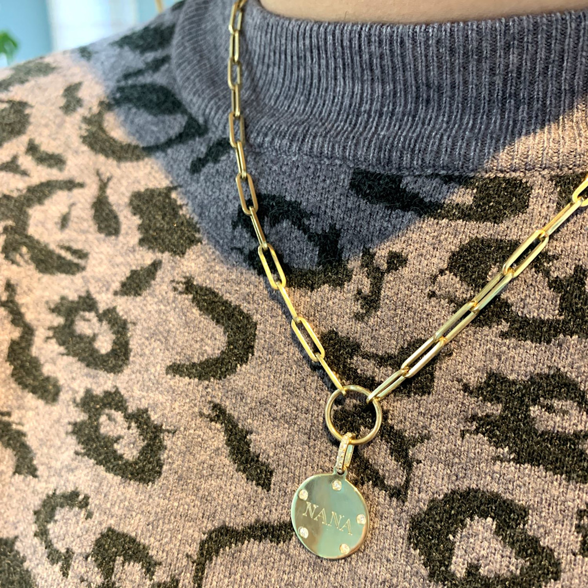 The Gates Token Necklace is a engraveable round pendant with .014 carats of full cut diamonds around the charm and on the bail.  The charm is attached to a large jumpring and sits on a thick 18″ with 2″ drop on a 14K large paperclip style chain. Additional charms from Erin’s collections and beyond can be added to the jumpring to add to build to your own charm story or neck mess. Chain and one line of engraving is included on the charm.