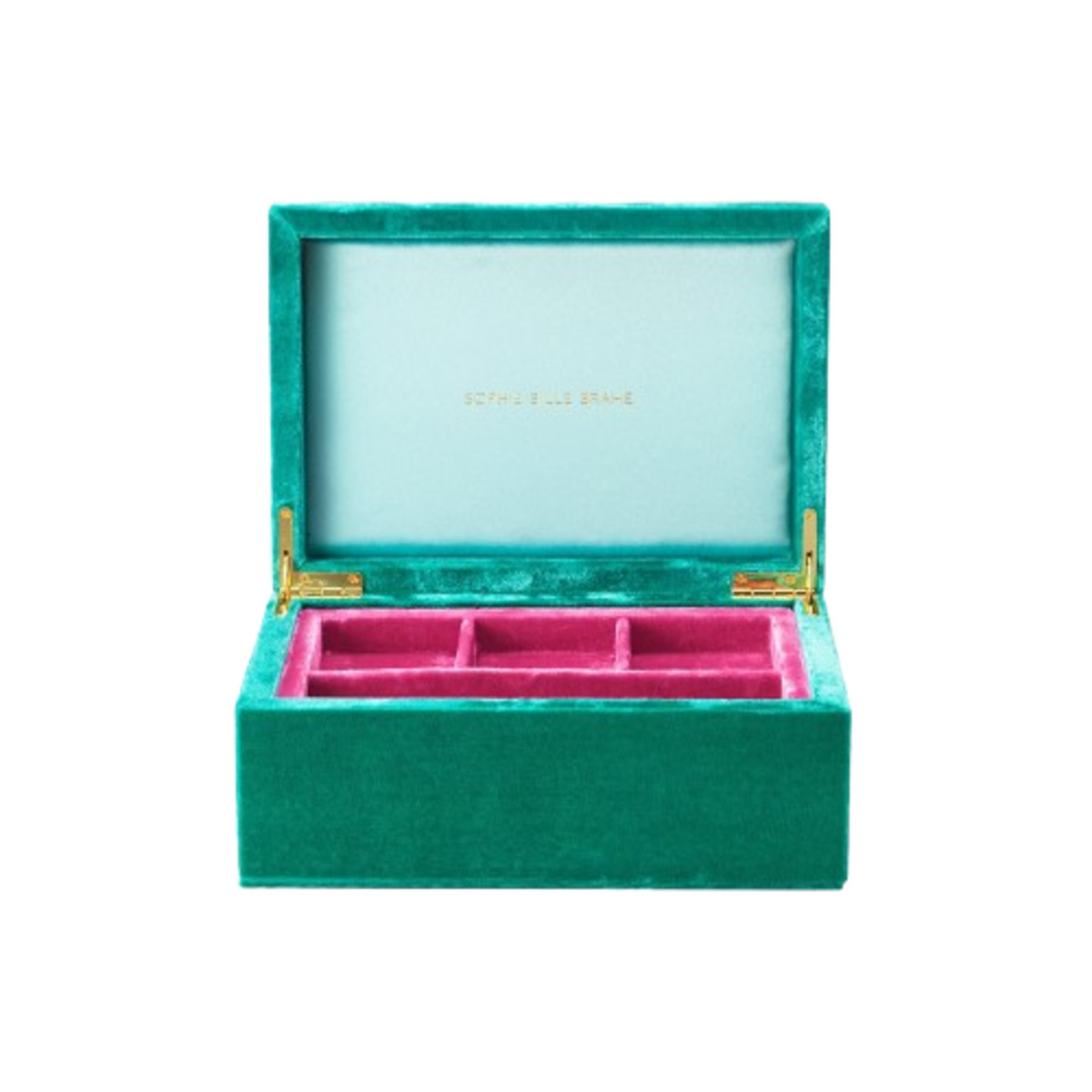 The Tresor Grande Jewelry Box from Sophie Bille Brahe features a removable top tray with 4 compartments. This box has green and pink plush silk velvet with a light green interior.