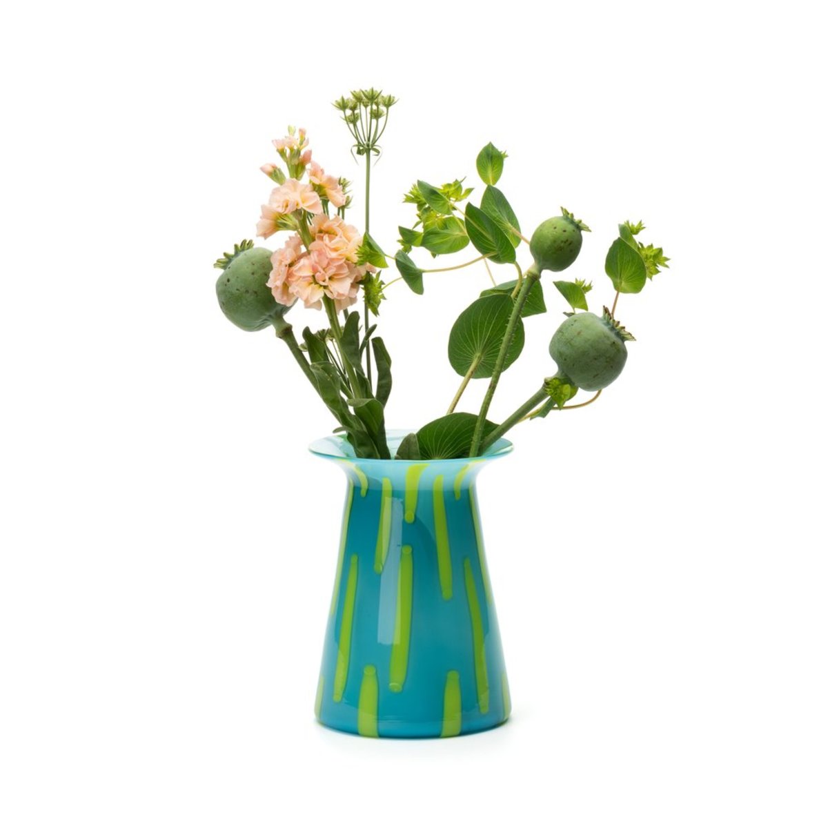 The turquoise medium sized Arpeggio Vase made from blown glass is bright, airy and fits perfecly on mantals and shelves.