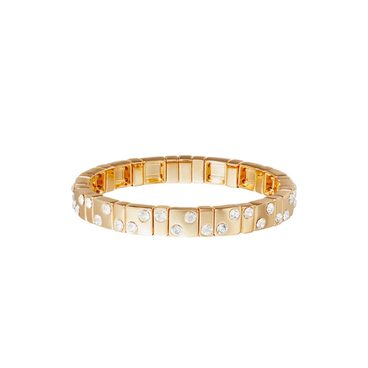 The Twinkle Twinkle Gold Bracelet by Roxanne Assoulin is a gold enamel stretch bracelet with glass crystal stones. This is the perfect layering bracelet to add some fun sparkle to your stack!
