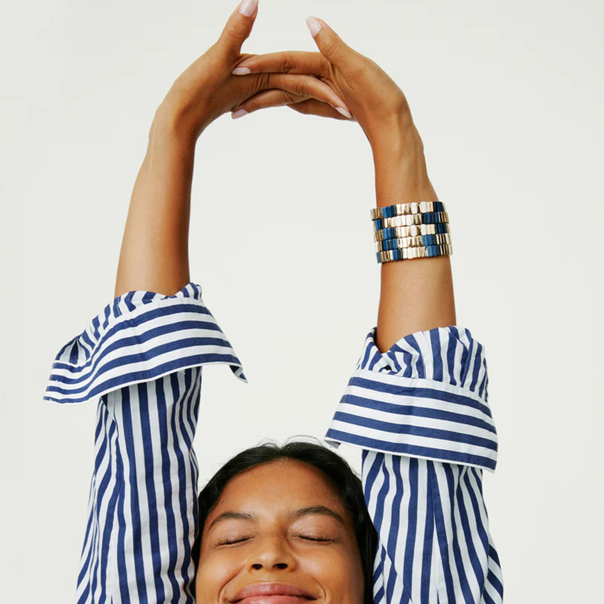 Black, navy, ivory and gold tone stretch enamel bracelet