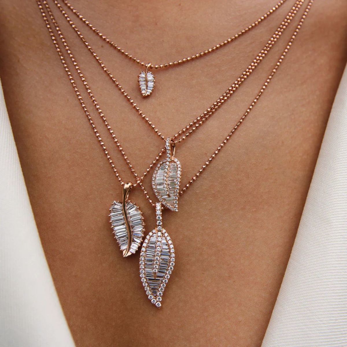 The Small Palm Leaf Necklace is a great alterative to a classic diamond pendant necklace featuring luxurious baguette diamonds in the iconic Anita Ko leaf silhouette. We love how the ball chain adds extra sparkle and texture!